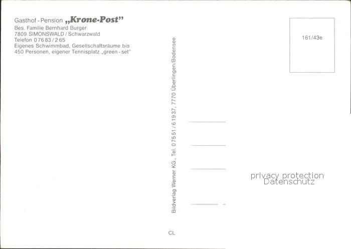 72243888 Simonswald Gasthaus Pension Krone Post postalisch nicht gelaufen Erhaltung siehe scans KatCode: 11110008316042