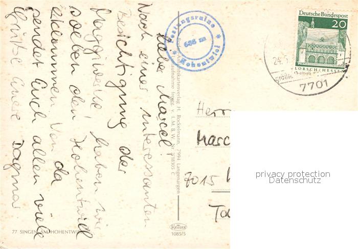 72970265 alte Postkarte Singen Hohentwiel Peter und Paulkirche Festung Ekkehardstrasse Wappen Fliegeraufnahme postalisch gelaufen Erhaltung siehe scans [FriedD77] KatCode: 11110008335075