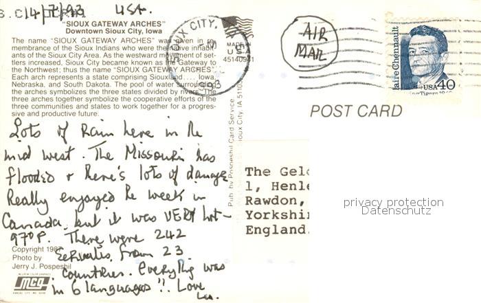 73126079 old postcard Sioux City Gateway Arches postalisch gelaufen Erhaltung siehe scans [KathaD81] KatCode: 14140170000000