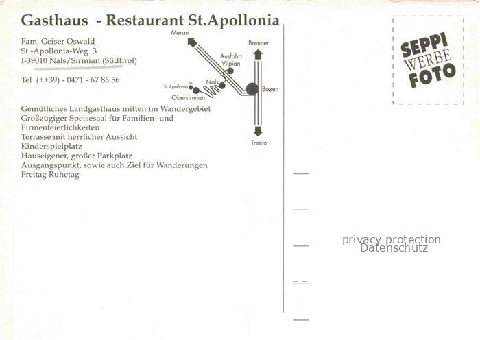 74042955 Sirmian Nals Nalles Suedtirol IT Gasthaus Restaurant St Apollonia Terrasse Gastraum postalisch nicht gelaufen Erhaltung siehe scans [WerneD78] KatCode: 11240