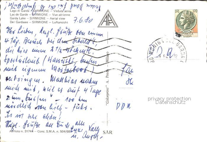 old postcard Sirmione Lago di Garda Gardasee Fliegeraufnahme postalisch gelaufen Erhaltung siehe scans