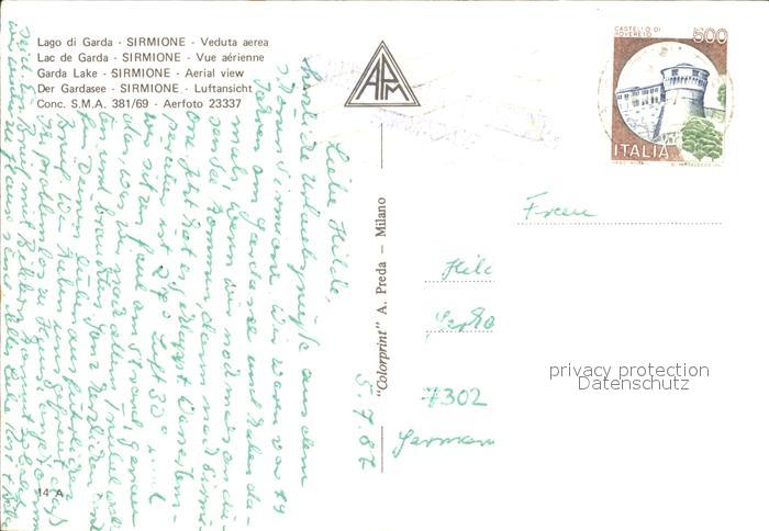 old postcard Sirmione Lago di Garda Gardasee Fliegeraufnahme postalisch gelaufen Erhaltung siehe scans