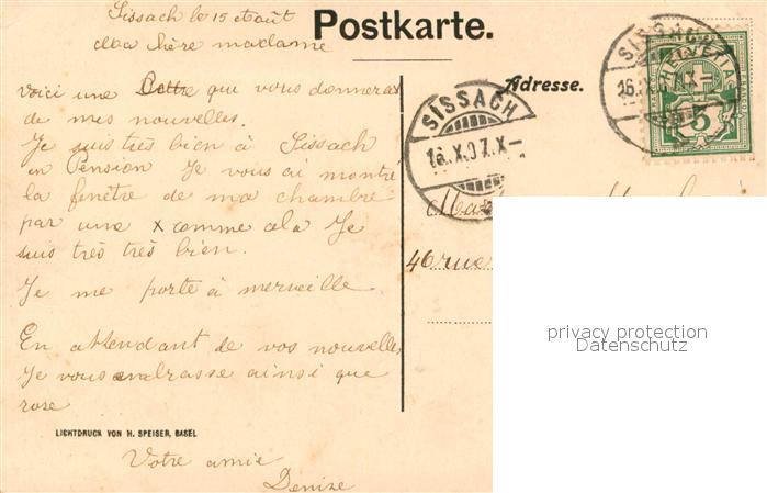 13566902 alte Postkarte Sissach Pensionat Regenass postalisch gelaufen Erhaltung siehe scans [KathaD81] KatCode: 11470040095734
