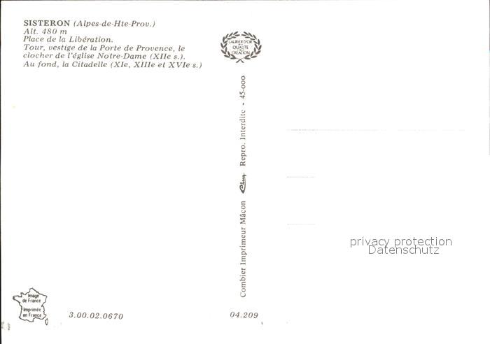 12221583 Sisteron Place de la Liberation Tour Porte de Provence Clocher Eglise Notre Dame Citadelle postalisch nicht gelaufen Erhaltung siehe scans KatCode: 11170004404209