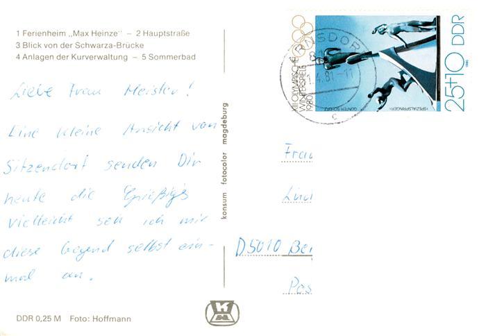 73890725 alte Postkarte Sitzendorf Thueringen Ferienheim Max Heinze Hauptstrasse Blick von der Schwarza Bruecke Anlagen der Kurverwaltung Sommerbad postalisch gelaufen Erhaltung siehe scans [WerneD78] KatCode: 11110016073084