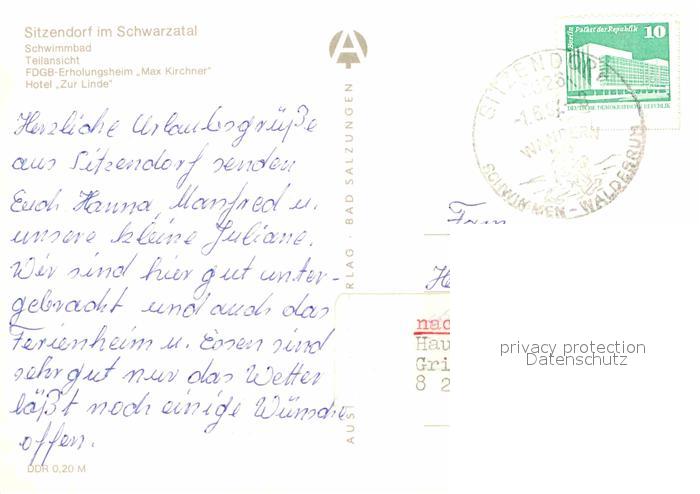 72627732 alte Postkarte Sitzendorf Thueringen Schwimmbad Panorama FDGB Erholungsheim Max Kirchner Hotel Zur Linde postalisch gelaufen Erhaltung siehe scans [WerneD78] KatCode: 11110016073084