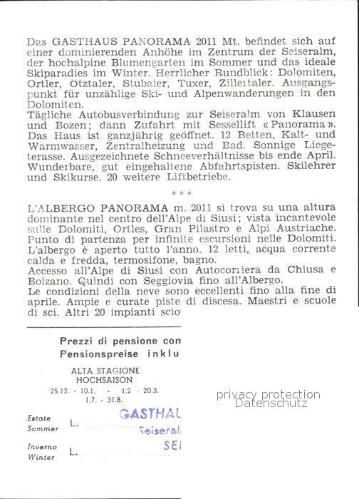 Siusi allo Sciliar Gasthaus Panorama Skispuren postalisch nicht gelaufen Werbekarte (keine Postkarte) Erhaltung siehe scans
