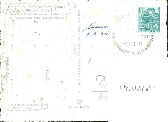 alte Postkarte Ski-Flugschanze Grosse Aschberg-Schanze Klingenthal Sachsen postalisch gelaufen Erhaltung siehe scans