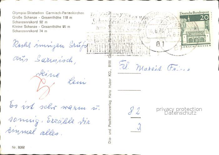 alte Postkarte Ski-Flugschanze Olympia-Skistadion Garmisch-Partenkirchen postalisch gelaufen Erhaltung siehe scans