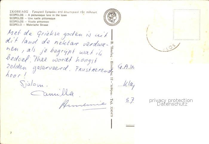 old postcard Skopelos Malerische Strasse postalisch gelaufen Erhaltung siehe scans