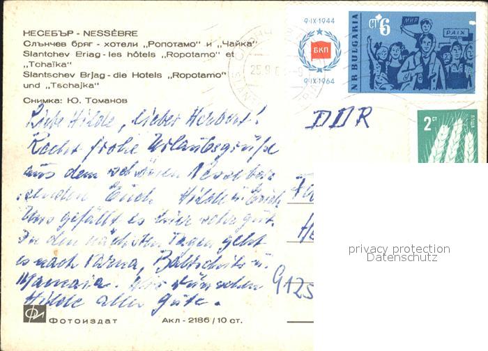 old postcard Slantschev Brjag Hotels Ropotamo und Tschajka Strand Segeln postalisch gelaufen Erhaltung siehe scans