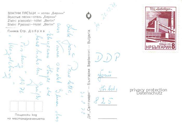74088030 old postcard Slatni Pjasazi BG Hotel Berlin postalisch gelaufen Erhaltung siehe scans [WerneD78] KatCode: 11090