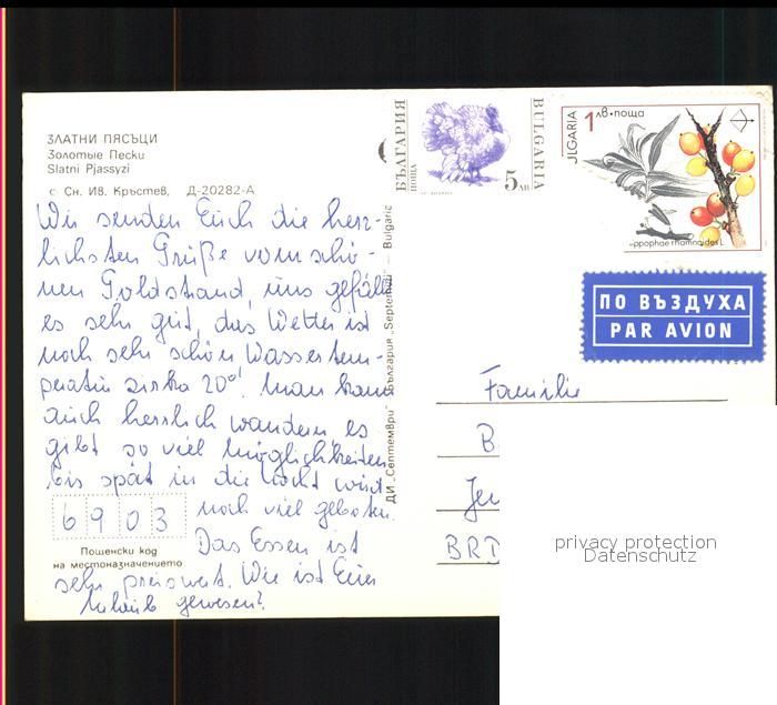 old postcard Slatni Pjasazi Hochhaeuser Sportboot mit Gleitschirm postalisch gelaufen Erhaltung siehe scans