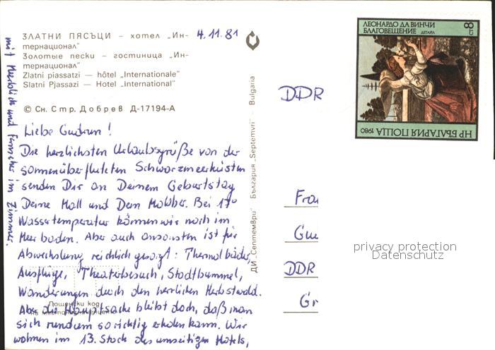 old postcard Slatni Pjasazi Hotel International postalisch gelaufen Erhaltung siehe scans