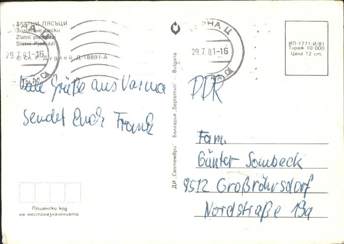 old postcard Slatni Pjasazi Strand Hotel postalisch gelaufen Erhaltung siehe scans