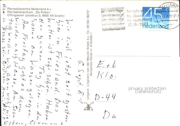 old postcard Sneek Recreatiecentra Nederland Recreatiecentrum De Potten Fliegeraufnahme postalisch gelaufen Erhaltung siehe scans
