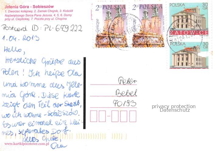 74005618 old postcard Sobieszow Kynast PL Dworzec kolejowy Zamek Chojnik Kosciol Najswietszego Serca Pana Jezusa Domy Poczta przy ul Chopins postalisch gelaufen Erhaltung siehe scans [WerneD78] KatCode: 11410