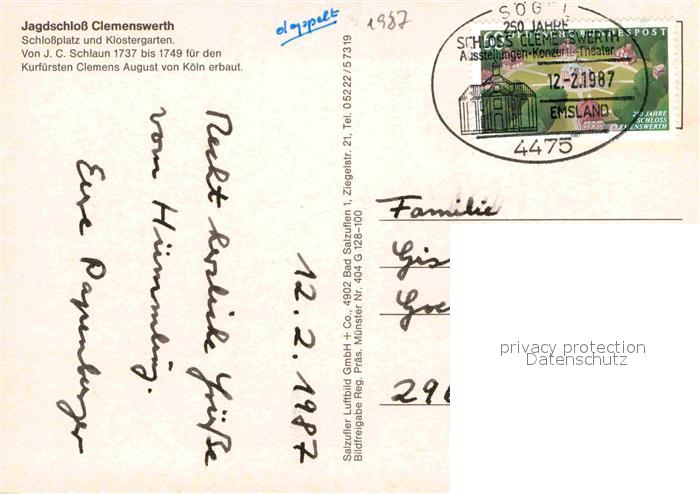 72897968 alte Postkarte Soegel Jagdschloss Clemenswerth Schlossplatz Klostergarten Fliegeraufnahme postalisch gelaufen Erhaltung siehe scans [FriedD77] KatCode: 11110003454047