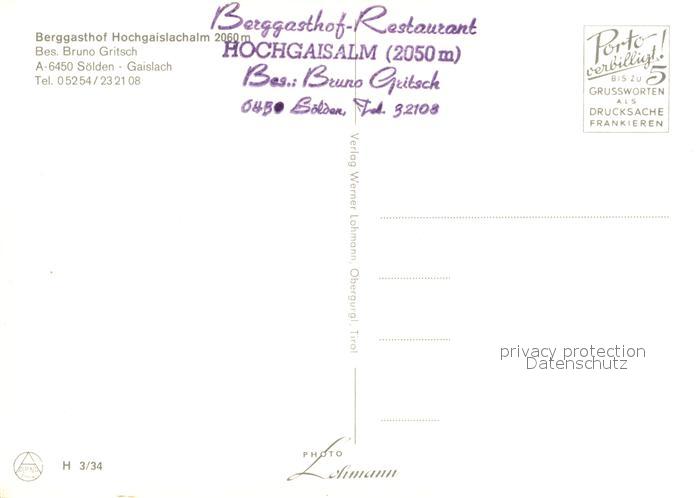 73049045 Soelden oetztal Berggasthof Hochgaislachalm postalisch nicht gelaufen Erhaltung siehe scans [KathaD81] KatCode: 11390334070220