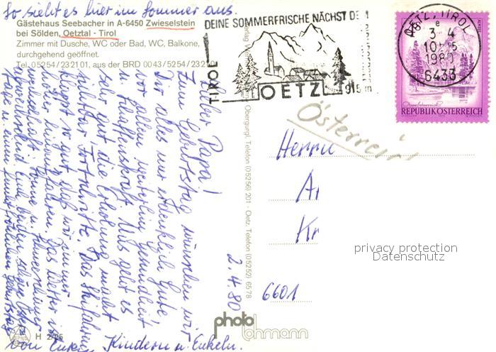 73167855 alte Postkarte Soelden oetztal Gaestehaus Seebacher postalisch gelaufen Erhaltung siehe scans [LiesaD40] KatCode: 11390334070220