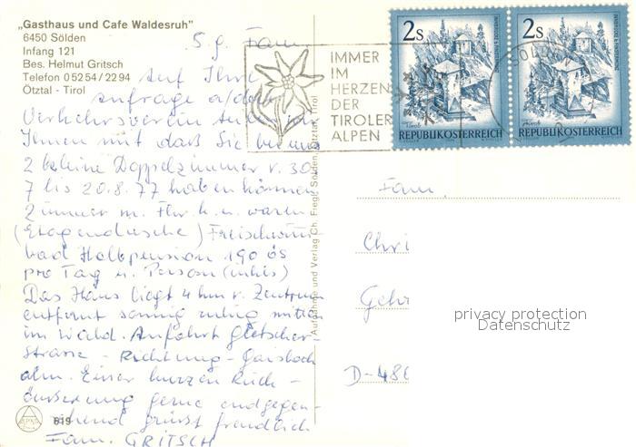 73643006 alte Postkarte Soelden oetztal Gasthaus Cafe Waldesruh oetztaler Alpen postalisch gelaufen Erhaltung siehe scans [FriedD77] KatCode: 11390334070220