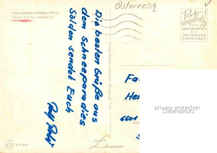 72907971 alte Postkarte Soelden oetztal Haus Isabella Gaestehaus Pension Wintersportplatz Alpen postalisch gelaufen Erhaltung siehe scans [FriedD77] KatCode: 11390334070220