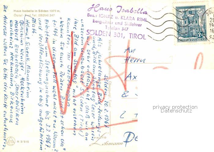 72756148 alte Postkarte Soelden oetztal Haus Isabella postalisch gelaufen Erhaltung siehe scans [LiesaD40] KatCode: 11390334070220