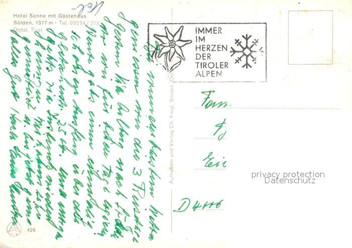 12954853 alte Postkarte Soelden oetztal Hotel Sonne Gaestehaus postalisch gelaufen Erhaltung siehe scans [NatalD47] KatCode: 11390334070220