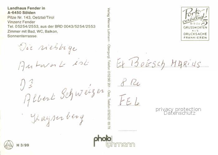 72666438 Soelden oetztal Landhaus Fender Fremdenzimmer postalisch nicht gelaufen Erhaltung siehe scans [FriedD77] KatCode: 11390334070220