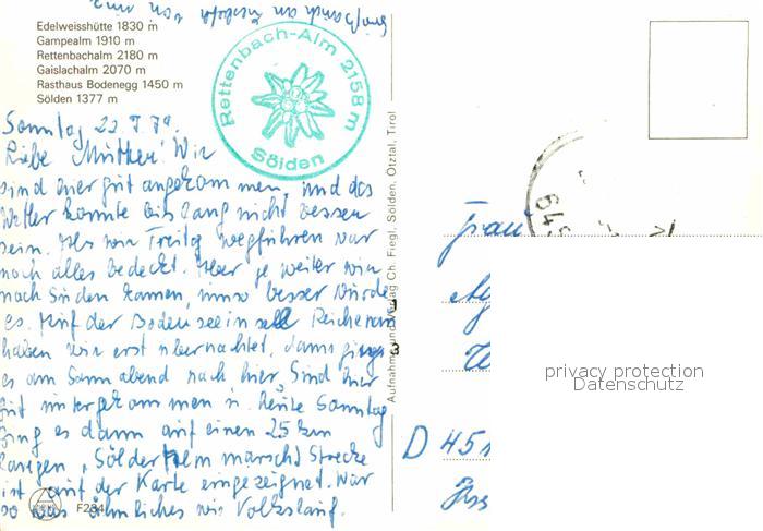 72884097 alte Postkarte Soelden oetztal Soelder Alm Marsch Edelweisshuette Gampealm Rettenbachalm Gaislachalm Rasthaus Bodenegg Soelden postalisch gelaufen Erhaltung siehe scans [WerneD78] KatCode: 11390334070220