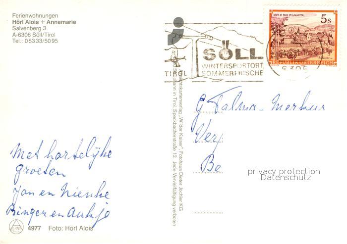 73033393 alte Postkarte Soell Tirol Ferienwohnungen Hoerl Alois + Annemarie postalisch gelaufen Erhaltung siehe scans [PaolaD17] KatCode: 11390335070526