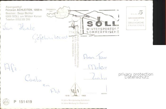 72254389 alte Postkarte Soell Tirol Pension Achleiten postalisch gelaufen Erhaltung siehe scans KatCode: 11390335070526