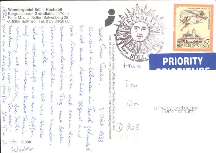 72297354 alte Postkarte Soell Tirol Wandergebiet Soell Hochsoell Bergrestaurant Gruendlalm postalisch gelaufen Erhaltung siehe scans KatCode: 11390335070526