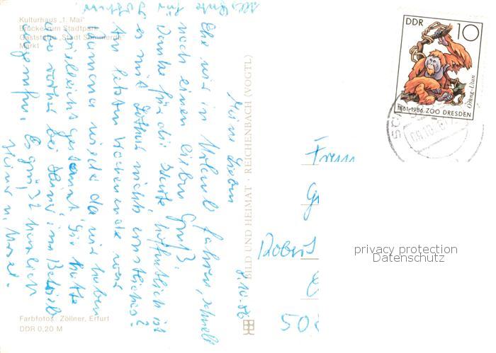 73845328 alte Postkarte Soemmerda Kulturhaus Erster Mai Bruecke zum Stadtpark Gaststaette Stadt Soemmerda Markt postalisch gelaufen Erhaltung siehe scans [FriedD77] KatCode: 11110016068051