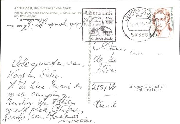 72305185 alte Postkarte Soest Arnsberg Kleine Osthofe mit Hohnekirche postalisch gelaufen Erhaltung siehe scans KatCode: 11110005974040