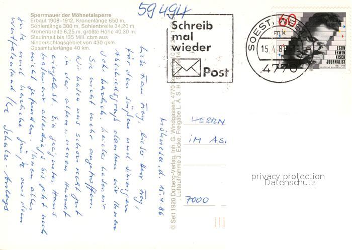 73095751 alte Postkarte Soest Arnsberg Sperrmauer Moehnetalsperre Fliegeraufnahme postalisch gelaufen Erhaltung siehe scans [NatalD47] KatCode: 11110005974040