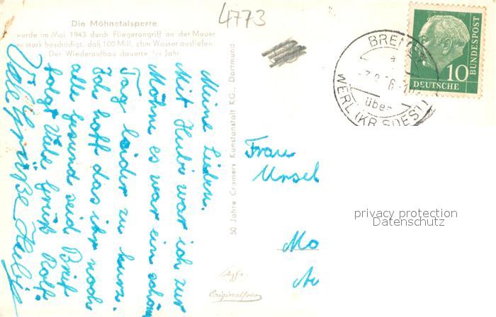 73694063 alte Postkarte Soest DE NRW Durchbruch der Moehnetalsperre nach Fliegerangriff im Mai 1943 postalisch gelaufen Erhaltung siehe scans [WerneD78] KatCode: 11110005974040
