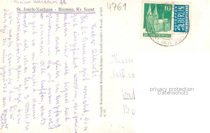73703911 alte Postkarte Soest DE NRW St. Josefs-Kurhaus Bremen postalisch gelaufen Erhaltung siehe scans [LiesaD40] KatCode: 11110005974040