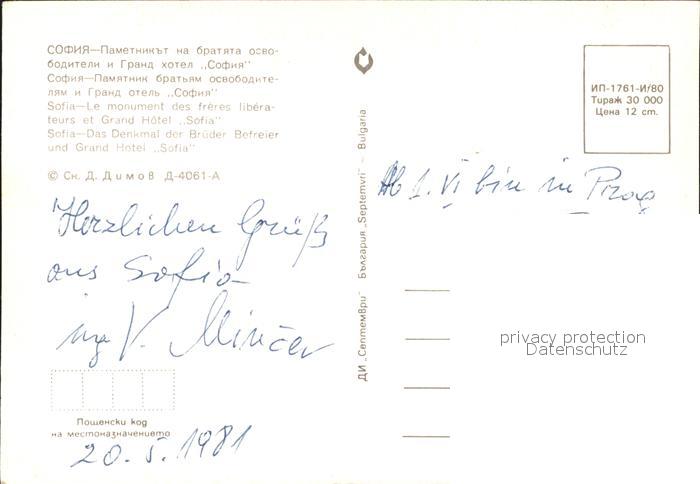 Sofia Sophia Denkmal Brueder Befreier Grand Hotel Sofia postalisch nicht gelaufen