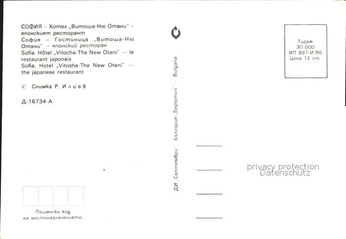 Sofia Sophia Hotel Vitosha The New Otani Japanese Restaurant postalisch nicht gelaufen Erhaltung siehe scans
