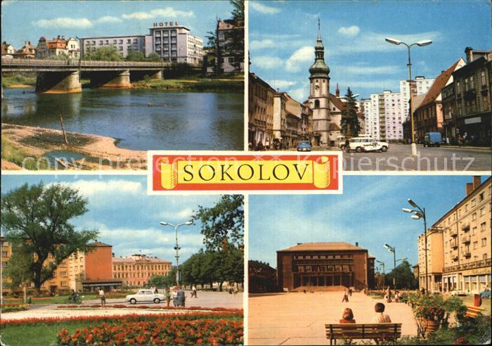 old postcard Sokolov Bruecke Hotel Kirche Platz Gebaeude postalisch gelaufen Erhaltung siehe scans