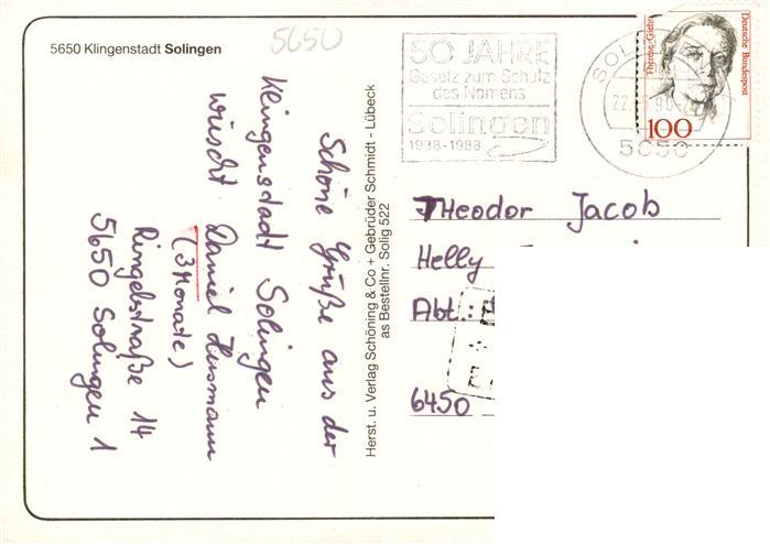 73942895 alte Postkarte Solingen St Clementskirche Hauptstrasse Graf Wilhelm Platz Fussgaengerzone Solingen Graefrath Klingen Museum Muengstener Bruecke Schloss Burg postalisch gelaufen Erhaltung siehe scans [WerneD78] KatCode: 11110005122000