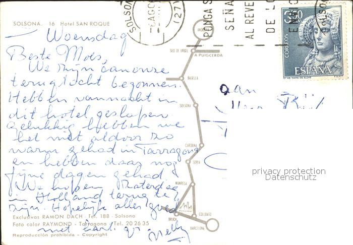 old postcard Solsona Hotel San Roque postalisch gelaufen Erhaltung siehe scans