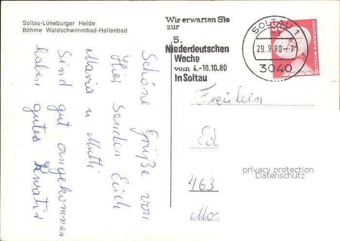 72138166 alte Postkarte Soltau Boehme Waldschwimmbad Hallenbad Lueneburger Heide postalisch gelaufen Erhaltung siehe scans KatCode: 11110003358021