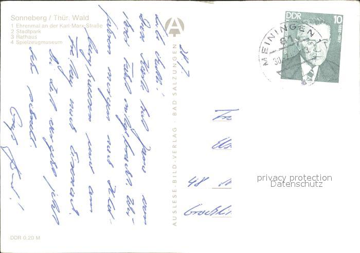 72369212 alte Postkarte Sonneberg Thueringen Ehrenmal an der Karl Marx Strasse Stadtpark Rathaus Spielzeugmuseum postalisch gelaufen Erhaltung siehe scans KatCode: 11110016072018