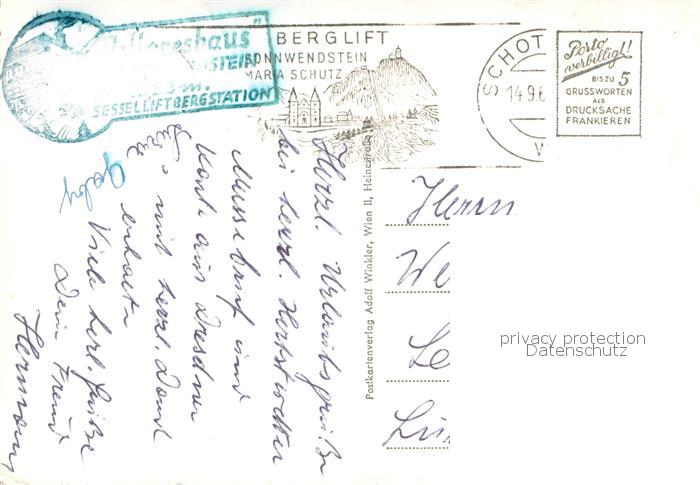 73756877 alte Postkarte Sonnwendstein 1523m AT Pollereshaus Sessellift Helden-Gedaechtnis-Kapelle Raxalpe postalisch gelaufen Erhaltung siehe scans [LiesaD40] KatCode: 11390