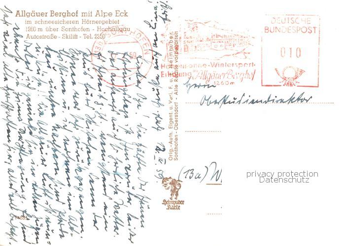 73765165 alte Postkarte Sonthofen Oberallgaeu Allgaeuer Berghof mit Alpe Eck postalisch gelaufen Erhaltung siehe scans [FriedD77] KatCode: 11110009780139