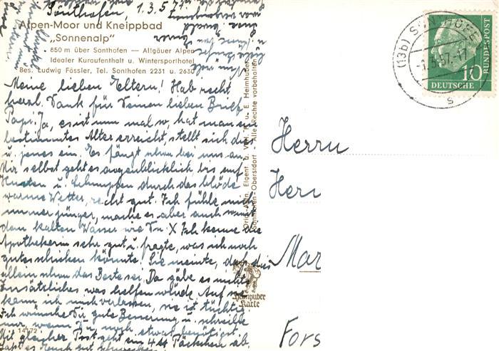 73892874 alte Postkarte Sonthofen Oberallgaeu Alpen Moor und Kneippbad Sonnenalp postalisch gelaufen Erhaltung siehe scans [WerneD78] KatCode: 11110009780139