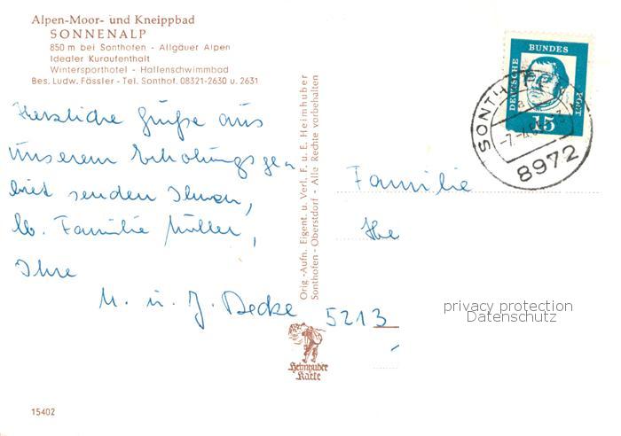 73803711 alte Postkarte Sonthofen Oberallgaeu Alpen Moor und Kneippbad Sonnenalp Hallenbad postalisch gelaufen Erhaltung siehe scans [WerneD78] KatCode: 11110009780139