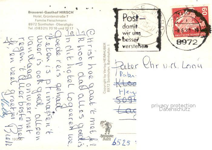 73717261 alte Postkarte Sonthofen Oberallgaeu Brauerei Gasthof Hirsch Zirbelstube Aufenthaltsraum Restaurant Hirschstube postalisch gelaufen Erhaltung siehe scans [WerneD78] KatCode: 11110009780139